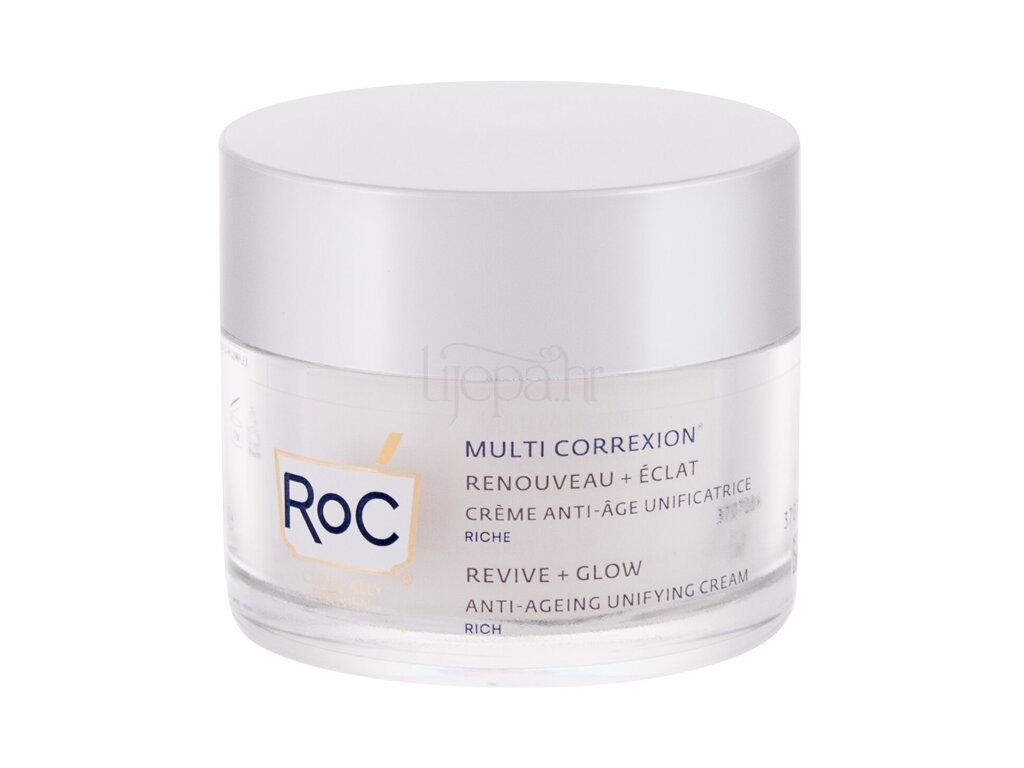RoC Multi Correxion Revive + Glow Anti-Aging Unifying Cream vraća mladolik izgled kože, koja bogatom i hranjivom formulom prodire u dublje slojeve kože, gdje ispunjava prijeko potrebnu vlagu i ispunjava bore. Matiranoj koži dodaje novu energiju i osvježava je. Završite svilenkasto mekom i svijetlom kožom.