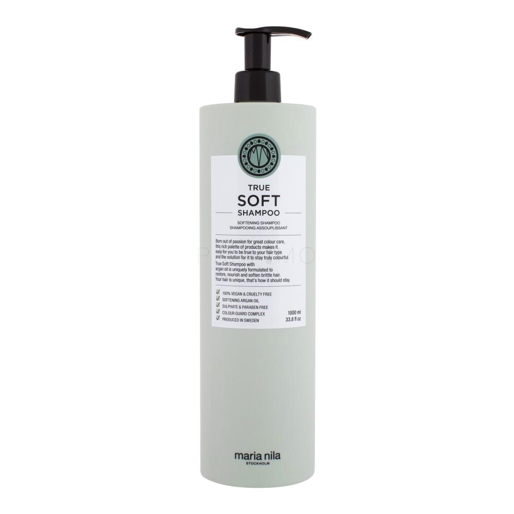 Maria Nila True Soft Shampoo šampon je za prirodno suhu kosu, koji omekšava, hidratizira i smanjuje toplinu i statički elektricitet. Sadrži puno omekšavajućeg arganovog ulja, antioksidansa i masnih kiselina, koje zadržavaju vlagu i jačaju kosu. Ima nježni miris vanilije, ruže i jasmina. Color Guard Complex čuva boju štiteći kosu od UV zračenja i slobodnih radikala.