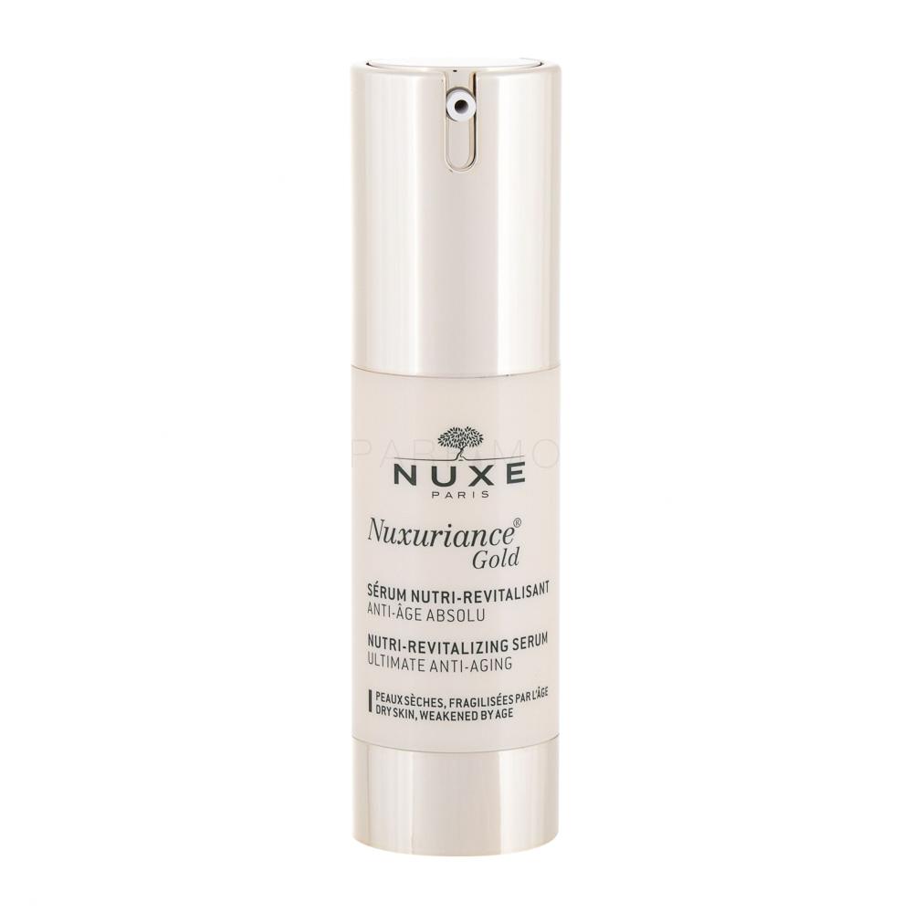 Revitalizirajući serum Nuxuriance Gold Nutri-Revitalizing Serum kombinira obnavljajuću snagu Bi-flower® stanica šafrana i bugenvilije, porculanskih ruža Oléoactif® i snažnog Nutri-revitalizirajućeg kompleksa za njegu kože protiv starenja. Od prvog nanošenja koža je blistavija, jer je temeljito nahranjena i time opet ugodna, meka i elastična. Njegova je formula poboljšana mikrohijaluronskom kiselinom biljnog podrijetla, koja jača kožu. Koža je glađa i čvršća i ima zdrav sjaj, kao da je okrijepljena.