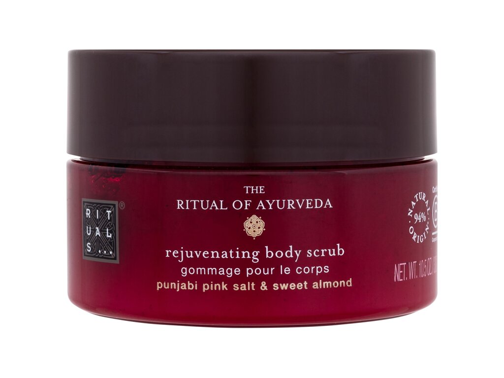 Rituals The Ritual Of Ayurveda Rejuvenating Body Scrub je piling za tijelo napravljen od 94% prirodnih sastojaka s učinkom pomlađivanja, koji sadrži pažljivo formuliranu baznu mješavinu bogatih ulja i pandžabske ružičaste soli.