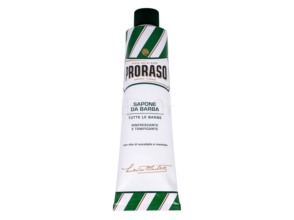 PRORASO Green Shaving Soap In A Tube pruža bogat, kremast sloj pjene za glatko brijanje. Posebna formula učinkovito omekšava i umiruje suhu kožu. Dodana ulja metvice i eukaliptusa održavaju kožu elastičnom, umiruju je i njeguju svježe obrijanu kožu te joj na kraju daju bogat miris. Dodani glicerin omogućava da britva glatko klizi.