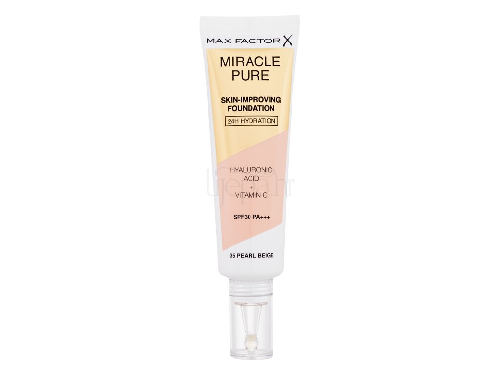 Max Factor Miracle Pure Skin-Improving Foundation SPF30 je tekuća podloga za koju je klinički dokazano da hrani i štiti kožu dok je nosite. U samo jednoj minuti i sa samo jednom kapi obnavlja kožu i blagotvorno djeluje na pet načina: poboljšanom blistavošću, čvrstoćom, elastičnošću, gustoćom i gipkošću. Lagan je i praktički nevidljiv na koži te ima inovativnu formulu čija je zadaća aktivno poboljšavati stanje i izgled kože.