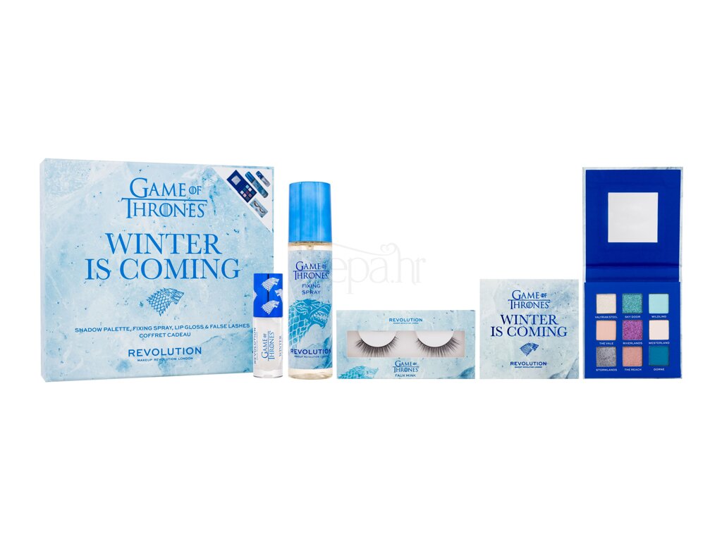 paleta sjenila Game Of Thrones 7,2 g + fiksator šminke Game Of Thrones 100 ml + umjetne trepavice Game Of Thrones 1 par + sjajilo za usne Game Of Thrones Shimmer Bomb Lip Gloss 5 ml Winter Is Coming