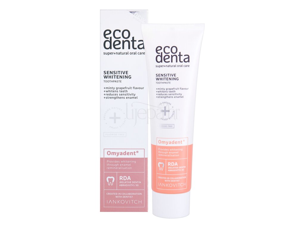 Tražite li zubnu pastu za osjetljive zube s učinkom izbjeljivanja? Ne tražite dalje. Profesionalna tvrtka za zubnu njegu Ecodenta ima pravu zubnu pastu samo za vas. Pasta za zube Sensitive Whitening Toothpaste Omyadent je pasta za zube za izbjeljivanje, koja nježno njeguje osjetljive zube. Uz ugodan okus mente i grejpa, radovat ćete se pranju zuba.